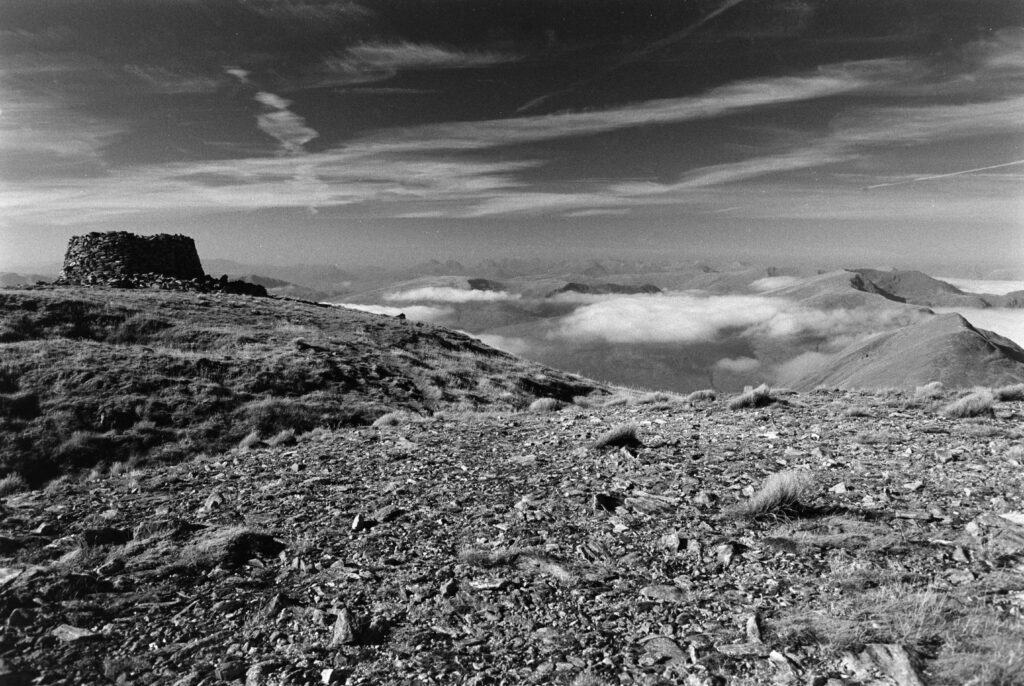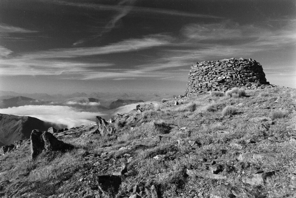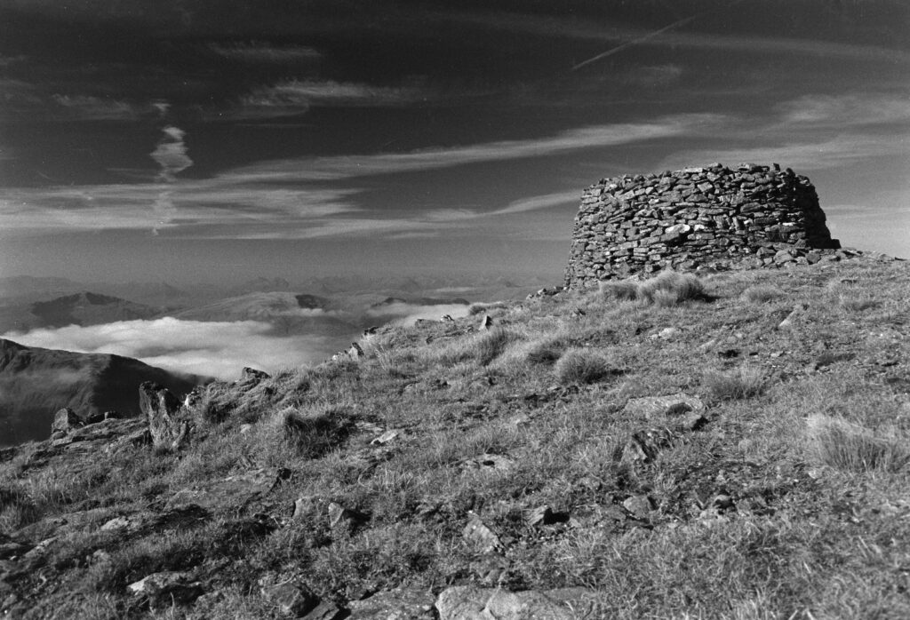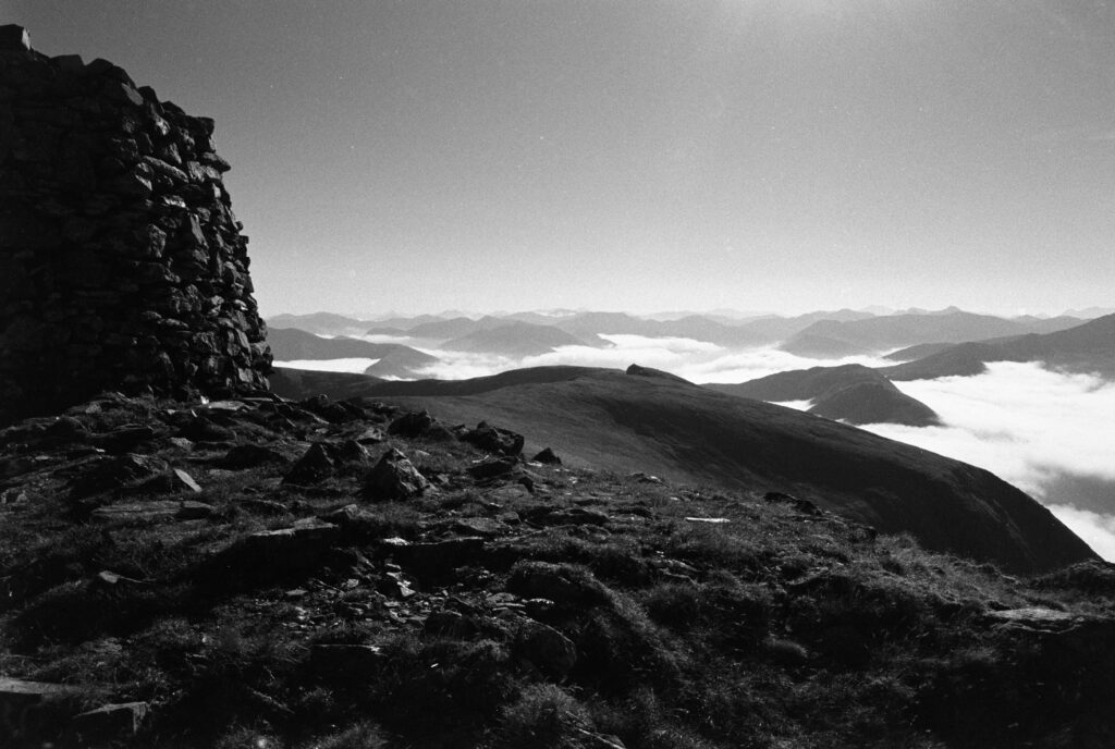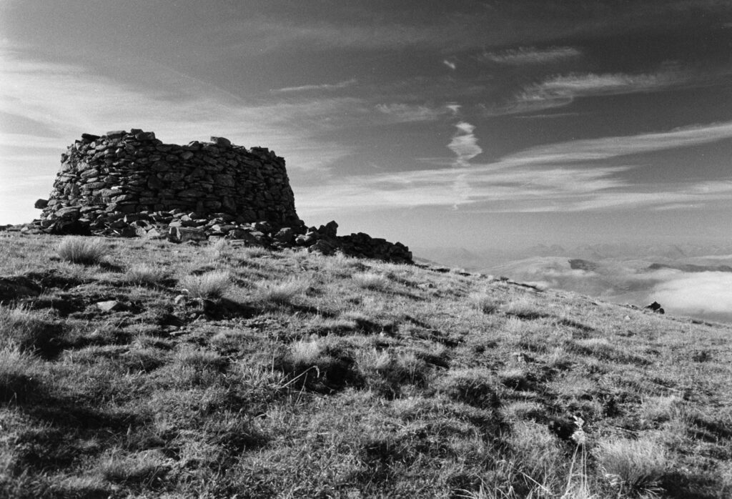 The strange cairn/broch-like construction at the top of Mam Soidheal threw me. It’s circular, single-walled, dry-stone construction, and the inner chamber is rectangular with no roof. Turns out it was built around the trig point in the 19th century, presumably at the same time as the ruined Colby camp bothy further down the slope. The weather must have been very harsh when they were sighting from this peak.