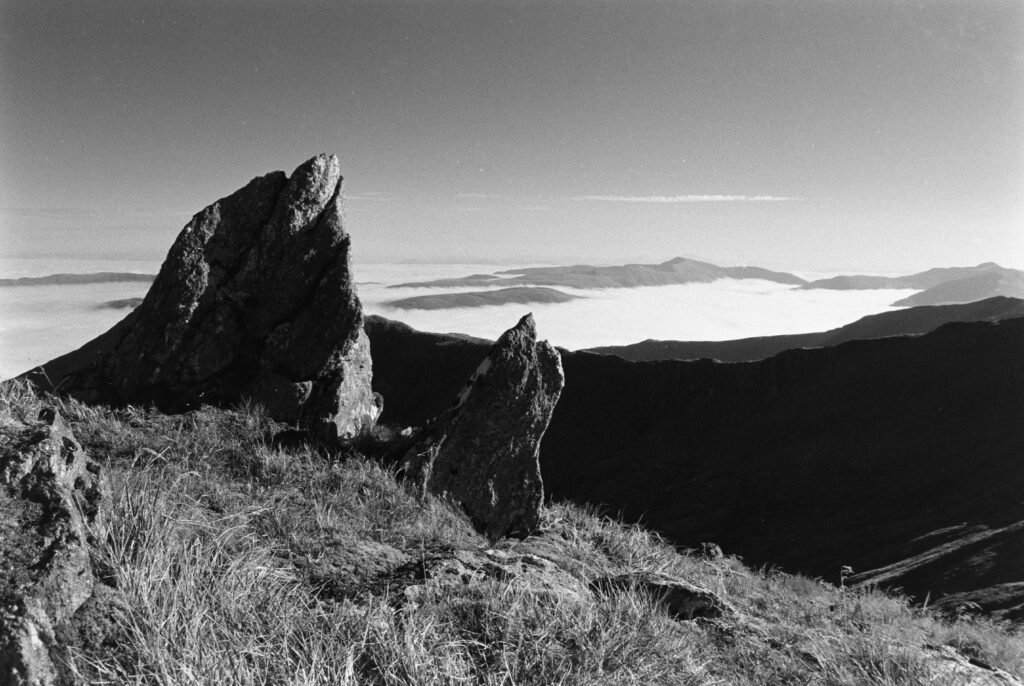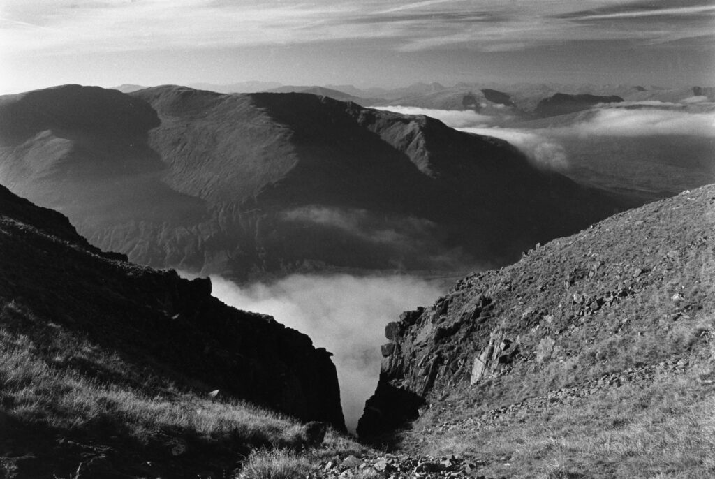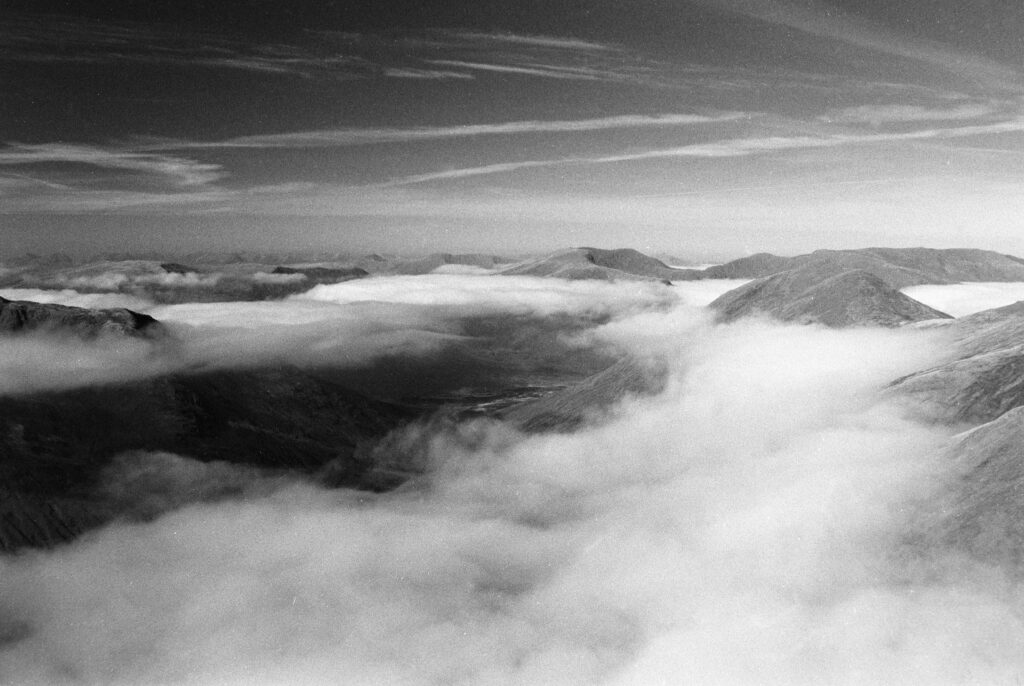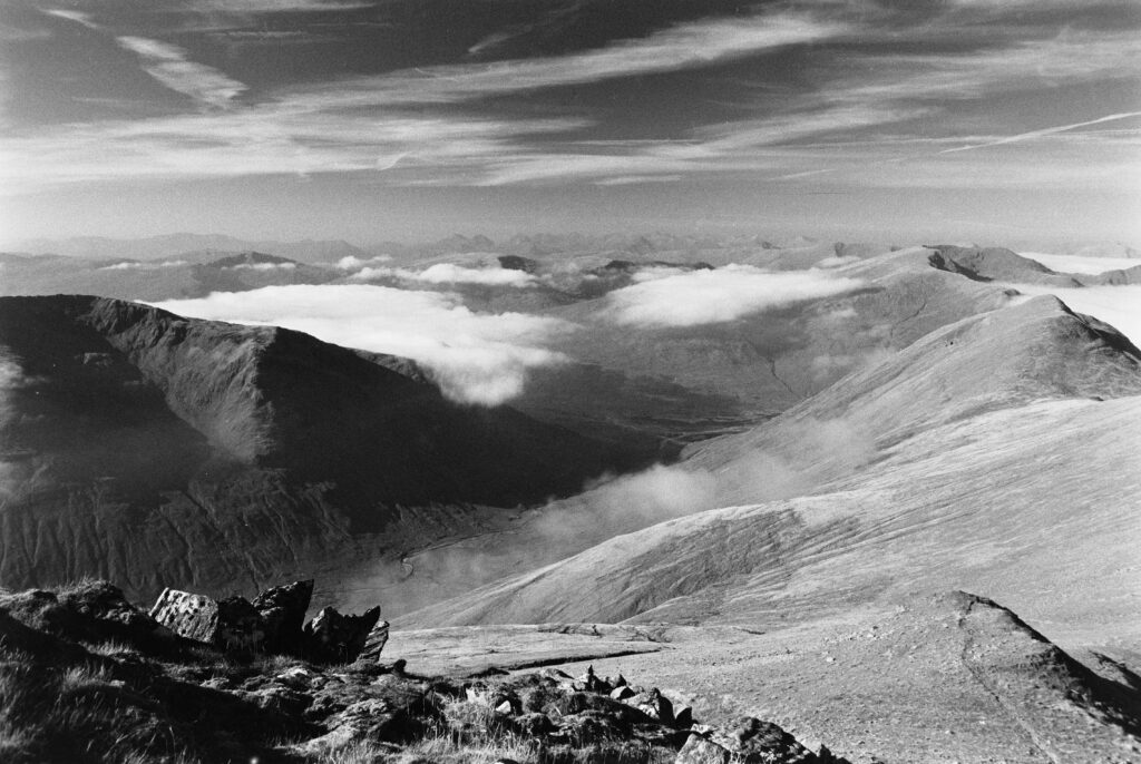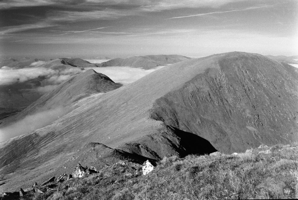 The strange cairn/broch-like construction at the top of Mam Soidheal threw me. It’s circular, single-walled, dry-stone construction, and the inner chamber is rectangular with no roof. Turns out it was built around the trig point in the 19th century, presumably at the same time as the ruined Colby camp bothy further down the slope. The weather must have been very harsh when they were sighting from this peak.